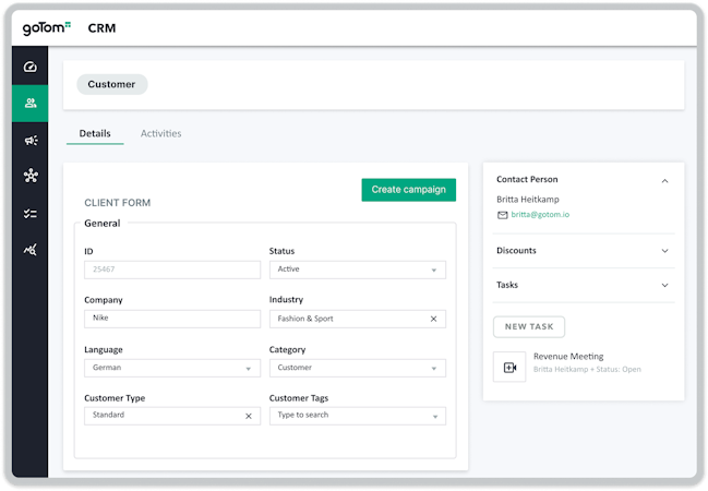 The core functionality of goTom is the order management tool that enables users to manage products and rate cards, empowering them to plan extensive campaigns with ease. The modern user interface ensures that navigating the processes is simpler and more intuitive. The software also facilitates customer relationship management by centralizing client data, tasks, and activities in a unified platform. Interactive dashboards allow users to monitor turnovers in real-time.