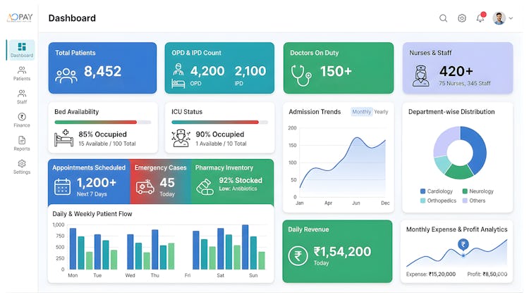 AOPAY Best Cloud Based Hospital Management Software with user-friendly healthcare management system simplify complex hospital operations. It centralizes patient data, appointments, billing, pharmacy, lab, and administrative tasks into one intelligent solution.