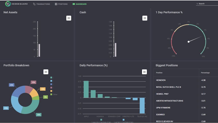Our portfolio management system is designed for asset managers, fund managers, family officers or crypto-funds managers. HedgeGuard front-to-back software solution, includes a position keeping module, reporting capabilities alongside order management, risk management, and compliance management tools. It also supports additional services including middle-office outsourcing and virtual desktop infrastructure (VDI).