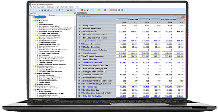 Income Tax Planner lets users deliver insightful client presentations using graphs, letters, and reports to weigh the pros and cons of various strategies and better manage their tax liability. The QuickStart templates are pre-populated, scenario-based worksheets, which enable teams to calculate estimated taxes, determine residential rental income or loss, minimize net investment income tax, and rollover traditional IRA to Roth IRA.