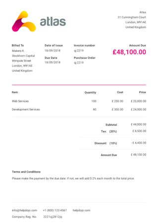 Invoice Template offers users a range of customizable templates, to which users can add their business’ logo, terms & conditions, notes, and more. Multiple products and services can be added to a single invoice, and users can choose to add VAT/sales tax with full control over tax rates. Flat rate and percentage discounts and shipping fees can be included, and tax can also be added on to shipping charges if required.