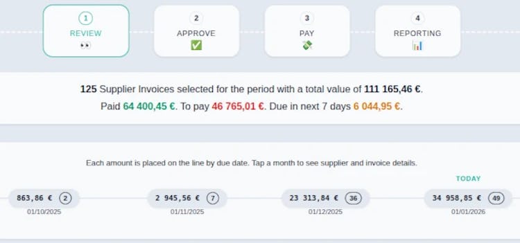 The approval workflow supports unlimited users without additional licensing fees, with an approvals overview dashboard that enables operations managers and administrators to monitor which team members must review specific invoices. The system tracks invoices as pending review, approved and paid. Duplicate detection functionality runs multiple checks on incoming invoices to identify potential duplicates before approval or payment processing. Payment tracking features include due-date reminders to help teams stay current with upcoming obligations. The supplier management system allows maintenance of a clean supplier list with the ability to merge duplicate entries. Monthly reporting and export capabilities deliver structured data formats that reduce manual cleanup and minimize clarification requests from accounting teams.