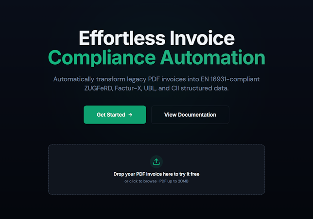 The platform provides AI-powered conversion tools that extract structured data from scanned or handwritten PDF invoices and transform it into compliant e-invoice formats. A creation module enables the generation of new electronic invoices with PDF slash A dash three bee conformance, embedding XML data directly into PDF containers. Validation functionality checks invoices against official XML schema definitions and Schematron business rules for each standard to support real-time compliance verification. Rendering and conversion tools convert between supported e-invoice formats and generate human-readable PDF representations while permitting cross-format transformations between Universal Business Language and the Cross-Industry Invoice standard. An extraction feature uses optical character recognition technology to parse unstructured invoice documents and output structured JSON or XML data with confidence scoring.