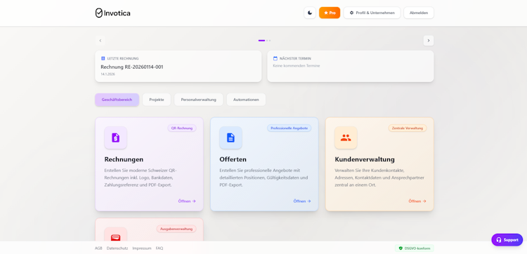 The platform provides financial management tools centered on core invoicing functionality. Users can generate Swiss QR invoices with company logos, banking details, payment references, and PDF export capabilities in compliance with national financial standards. Quotation creation functionality supports detailed line items, validity dates, and PDF export. The customer management module enables centralized administration of client contacts, addresses, contact details, and stakeholder information. The expense management feature enables recording of business expenditures and receipts, categorization of costs, and tracking of all expenses to provide a complete financial overview. Project management and personnel administration modules include automation workflows that streamline repetitive business processes.