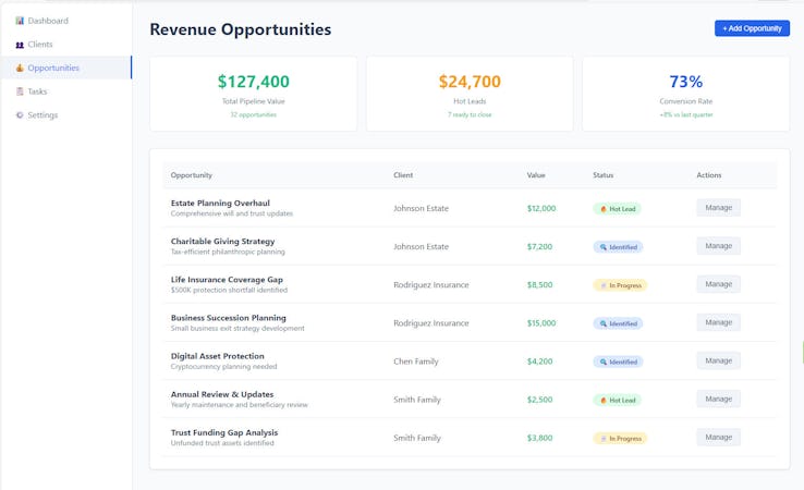 Advisors automatically identify specific opportunities including Life Insurance Gap Analysis, Estate Planning Updates, Digital Asset Planning, Business Succession Planning, beneficiary misalignment detection, and trust optimization. The revenue opportunity dashboard provides real-time visibility for prioritizing outreach and tracking conversions.