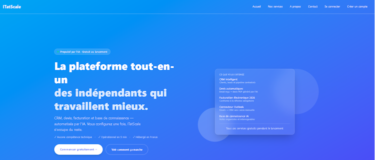ITatScale is a cloud based customer relationship management and business automation solution designed to meet the administrative requirements of French language independent professionals and very small enterprises. The software delivers an integrated interface that combines customer relationship management functionality, automated quotation generation, electronic invoicing compliant with anticipated regulatory requirements of twenty twenty six, and email handling features. The platform targets users without specialized technical expertise who seek to manage client relationships, sales pipelines, and billing workflows from a central dashboard hosted on French servers to ensure compliance with European data protection regulations.