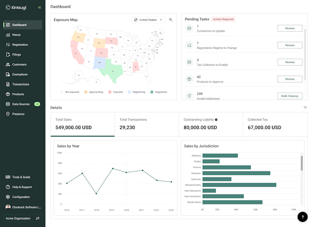 Kintsugi differentiates itself through accurate nexus tracking and tax mapping across countries and jurisdictions, helping businesses avoid costly audits and compliance failures. The system supports tax requirements across United States states and cities as well as Canadian provinces, making it suitable for businesses with complex multi-jurisdictional operations. The platform delivers both technical automation and human support through its white glove service model, ensuring businesses receive the assistance needed to navigate complex tax compliance challenges.