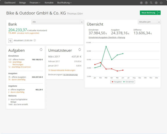 Features of lexoffice include quote management, online banking, payment reconciliation, document management, and customer and supplier management. The interface provides a dashboard for finances, accounts, and tasks. Invoices are generated within a few clicks and receipts and documents can be captured automatically thanks to the Scan app. If the company is working internationally, German-language documents can be translated to English with the click of a button. This functionality is available for invoices, quotes, order confirmations, delivery notes, and recurring invoices.