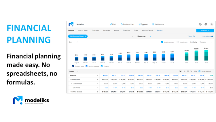 Modeliks is a business planning software for startups & SMEs that allows users to create pitch decks, bankable business plans, accurate financial plans & investor reports. Reports are calculated in automated dashboards. Users can create an investor-ready pitch deck and a bankable business plan, build accurate, driver-based financial plans, and track their performance with automated dashboards.