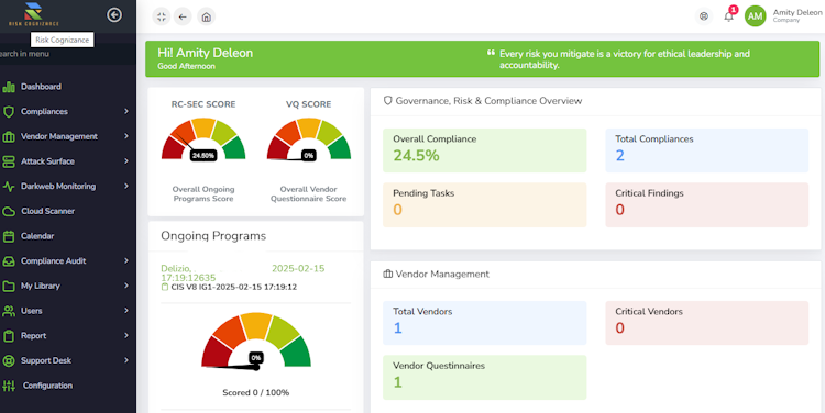 Risk Cognizance enhances operational efficiency through automation and orchestration features that streamline routine tasks such as compliance checks, vulnerability scanning, and incident response. The platform combines enterprise risk management, attack surface management, third-party risk management, project management, policy management, automated risk assessments, and dark web monitoring into a single cohesive system. This integration ensures continuous compliance monitoring and comprehensive risk management across all security domains, eliminating the need for multiple disparate tools.