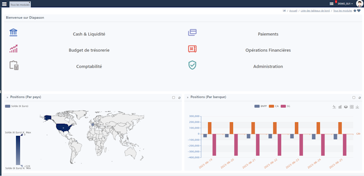 myDiapason Treasury is a treasury management solution designed for mid-caps and large corporates to enable treasurers to centrally manage all financial flows end-to-end. As a SaaS solution, it allows companies to manage corporate financial flows through an easy and quick implementation that interfaces with existing information systems. This integration makes reliable data available across functions - from liquidity management to financial and market risk hedging.