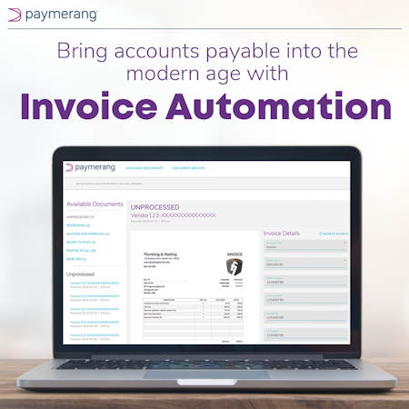 Paymerang provides a streamlined invoice and payment automation platform that brings Accounts Payable departments into the modern age. Paymerang's platform saves AP departments thousands of hours annually, enhances visibility, increases accuracy, improves efficiency, and earns rebates while reducing paper, fraud risks, and operating costs.