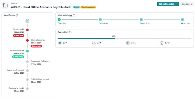 o A stand-out feature of Ideagen Internal Audit is its step-by-step tracker dashboards for audit methodology, key dates and audit execution. The methodology tracker will support any framework, from the latest IIA standards to ‘agile’ sprints based on your own criteria. This ensures everyone in the team works consistently to the same processes and standards. Each stage of the workflow is prompted automatically.
