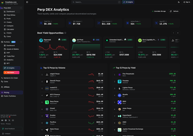 Perpstats is a web based analytics platform that aggregates data from more than two hundred and twenty four perpetual decentralized exchanges. It provides real time and historical insights into trading activity and protocol performance across decentralized perpetual futures markets. The platform presents data on total value locked, trading volumes, open interest and yield metrics for liquidity pools across multiple blockchain networks.