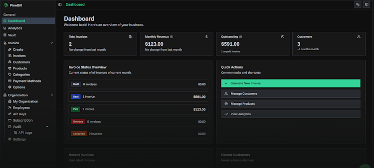 PineBill is an all in one invoicing software platform designed for small and mid sized businesses, freelancers, and contractors seeking to streamline billing processes. The system enables generation of professional invoices, management of client relationships, and processing of payments while maintaining organized financial records.
