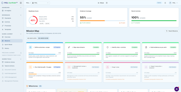 PIOL CertPath is an management system deployment and audit readiness platform designed to support organizations in implementing, maintaining and demonstrating compliance with international accreditation standards. The software provides a comprehensive framework for managing the entire compliance lifecycle from initial gap assessment through continuous audit readiness. The platform shifts the compliance approach to ISO certification and/or US & EU Regulations from reactive to proactive. The solution operates as a standalone system with a modular architecture addressing distinct aspects of compliance management.