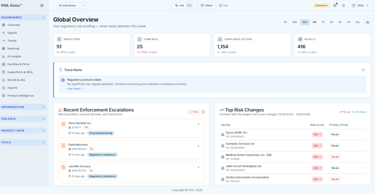 PIOL Radar is a regulatory intelligence platform that converts FDA enforcement data into compliance insights for pharmaceutical, medical device and biotechnology organizations. It aggregates information from multiple official FDA databases and applies artificial intelligence to generate compliance documentation, monitor enforcement trends and assess regulatory risks across facilities and supply chains.