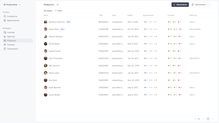 Producerflow simplifies appointment submissions and tracking. Users can submit appointments in bulk, monitor real-time statuses, and trigger just-in-time appointments, all integrated with NIPR. The software provides reporting tools to access data and create custom reports to track key metrics and trends.