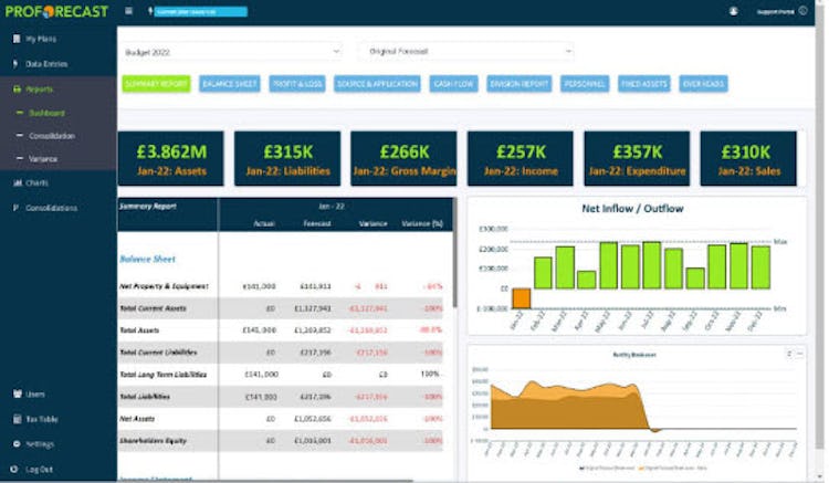 ProForecast CPM software helps users run financial forecasts, scenario, and sensitiviy analysis. Users can use integrated Monte Carlo analysis to risk test businesses, and integrate all financial analysis, performance management reports, intuitive business strategic analytics, and business intelligence dashboards in one software platform.