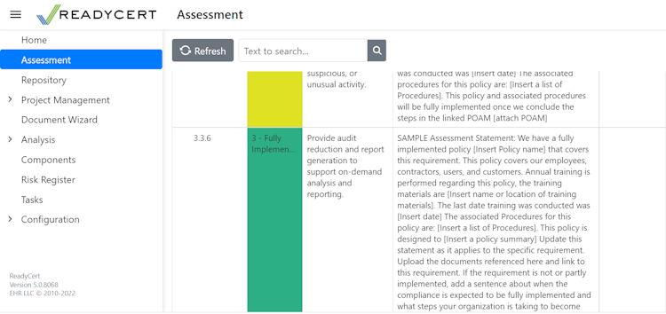 ReadyCert helps companies manage cybersecurity compliance programs within a secure platform hosted on the GCC High Cloud. It allows organizations to conduct gap assessments, create POAMs, and mitigate threats according to requirements.