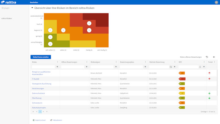 roXtra's risk management tool helps with qualitative risk analysis as well as with the management of the risks of your company. roXtra records and documents all events in accordance with the rules and enables corrective measures to be assessed. This creates transparency over the entire risk situation and lays the foundation for effective and efficient preventive measures. roXtra supports you in reducing the amount of work required for your company-wide risk management while at the same time complying with the current standard specifications (e.g. ISO 31000, ISO 15224, ISO 9001 and ISO 27001 / IEC 8001).