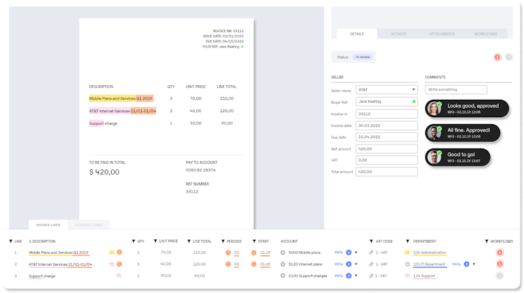 A mobile application compatible with Apple and Android operating systems facilitates invoice approval on the move, supporting distributed teams. The insights and analytics module delivers detailed spend analysis at the line item level by leveraging granular data captured by the platform. This information enables strategic sourcing decisions and highlights cost saving opportunities. The system maintains a full audit trail and provides explainable automation with AI confidence scores, allowing finance teams to review the basis for automated actions and focus on exceptions rather than routine processing.