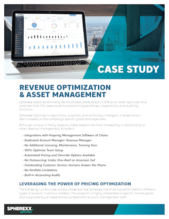 Spherexx Optimize Revenue Management is a sophisticated, scientific, algorithmic software that optimizes the rental and renewal rates for an apartment community based on current performance, predictive analysis, marketing conditions and disruptions