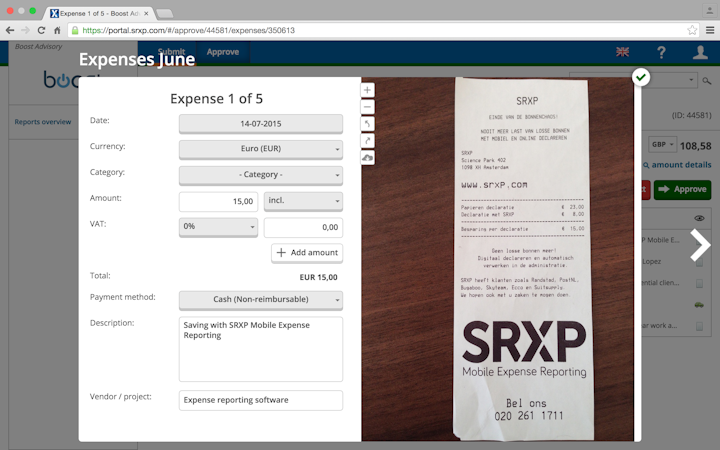 SRXP is a mobile app and web application for medium to large businesses that helps simplify the expense management process by allowing employees to snap and manage expenses anywhere in real time.