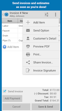 Create an invoice from your mobile device, anytime and anywhere. Record work that was done as soon as it was completed. Use the Item list for quick access to frequently used products or services. Enter customer information for your invoice right in Street Invoice or pull contacts from your phone. Record payments, and send professional invoices instantly. Send via email, SMS, chat, or even print right from your mobile device.