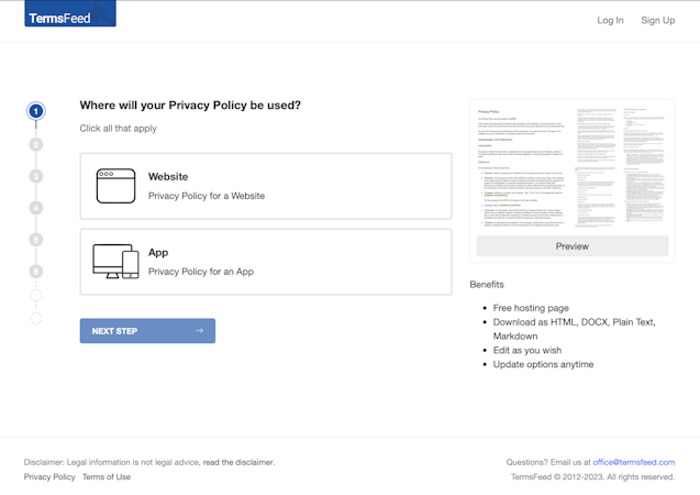 TermsFeed’s user interface