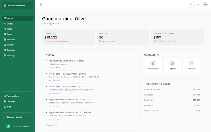 Track and Invoice is a cloud based time tracking and invoicing solution designed for freelancers, independent contractors and small service businesses. The platform consolidates billable time monitoring, materials logging, expense management and client billing within a unified system that operates without requiring a monthly subscription. Service professionals in fields such as interior design, landscaping, general contracting, electrical work, plumbing, event planning, wellness services, coaching, tutoring and architecture can organize project workflows and financial data through a single interface.