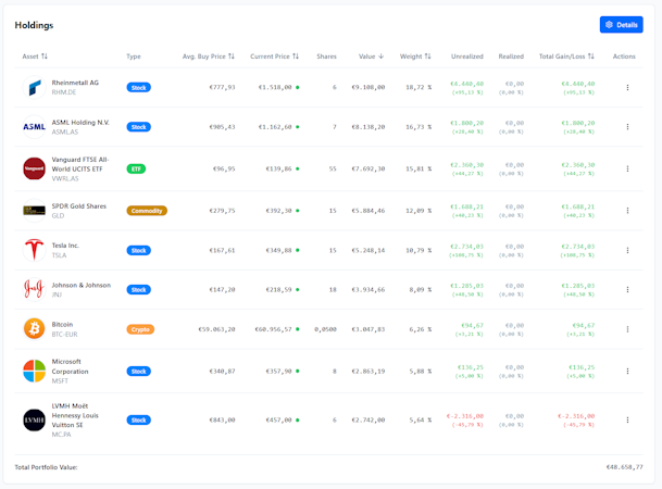 Benchmark comparison features offer side by side evaluation against major market indices such as the S and P five hundred, MSCI World and STOXX Europe six hundred. Portfolio analytics capabilities include sector allocation breakdown, geographical exposure analysis and identification of highest and lowest performing holdings. Realised and unrealised profit and loss are separated within the dashboard to enhance transparency. The dividend module maintains records of income distributions, calculates portfolio yield and tracks historical payment events.