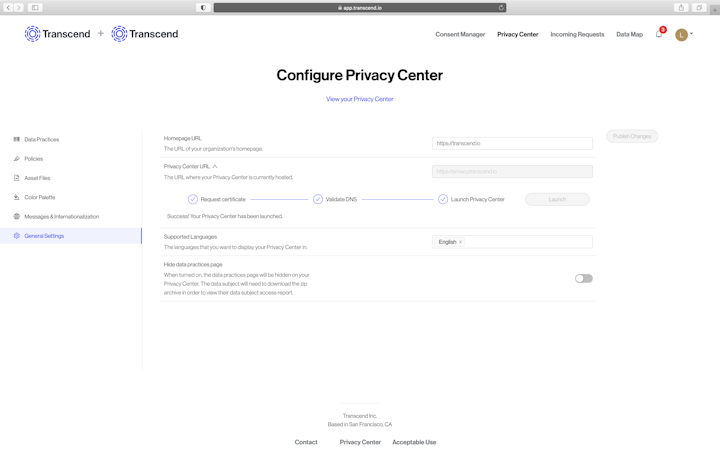 Transcend offers integration with various third-party applications such as Slack, Outreach, AppsFlyer, SalesLoft, Asana, and more. Using the dashboard, administrators can configure the privacy center’s text styling, view all requests, and track data subject requests across the automation pipeline. Data is also protected through AES-256 encryption before transferred to cloud storage.