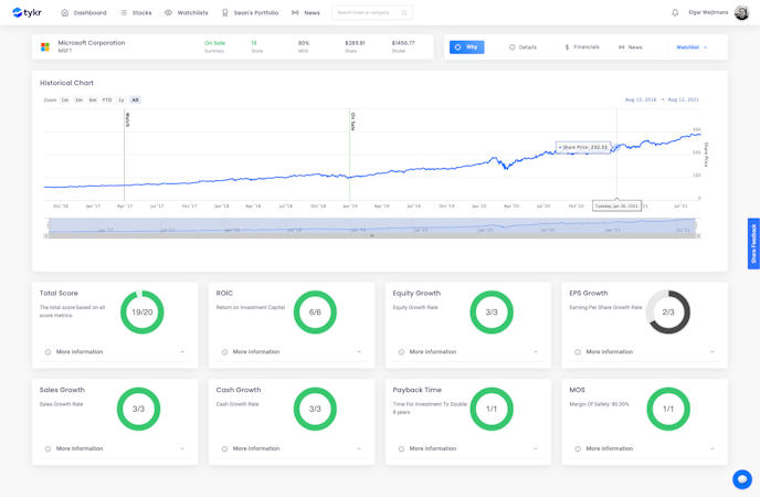 Tykr has an easy-to-understand rating system that clearly informs you on why a stock is rated on sale (potential buy), Watch, or overpriced (potential sell). This gives you the confidence to move forward and positions you as the expert when you share this knowledge with family, friends, and other investors.