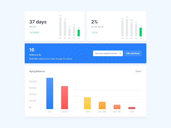 It provides real-time key A/R metrics (DSO, aging balance, etc.) and sends out automated yet personalized payment reminders. It also improves the payment experience for customers with several payment options (credit card, ACH, wire transfer, etc.) No set-up hassle to be expected: our software integrates in 1-click with your existing stack (Quickbooks, Xero, Chargebee, Stripe Billing, Zuora, Netsuite, Sage Intacct, Salesforce).