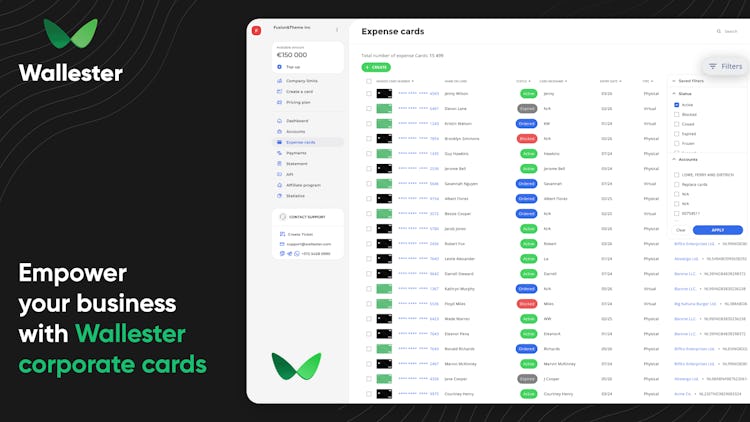 Wallester is authorized by the Finantsinspektsioon (Estonian Financial Supervision and Resolution Authority), and an official Visa Principal Member. Wallester allows businesses to issue their corporate VISA cards for any needs. Wallester Business is a great solution for: - advertising agencies / media buying teams - GIG economy companies - E-commerce platforms - travel agencies - all businesses who are looking for an effective way to manage their expenses