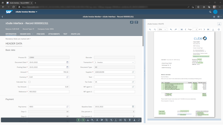 The capture component of xSuite Invoice comes with an SAP-integrated validation screen. The data capture results are displayed directly within SAP, along with the image of the invoices. Data from the invoice documents is checked for plausibility based on the applied ruleset and enriched with suggestions based on machine learning algorithms.