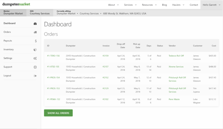 Dumpster Market’s user interface