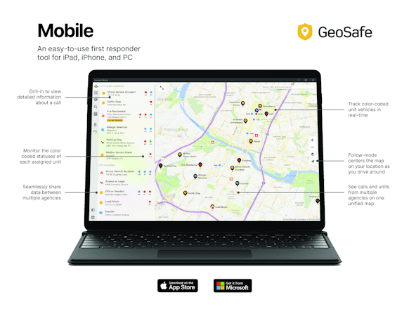 GeoSafe is a mobile-based app designed for first responders. The mobile module provides GPS tracking, CAD integration, interoperable data sharing, and security, ensuring streamlined flow of critical data to units in the field.