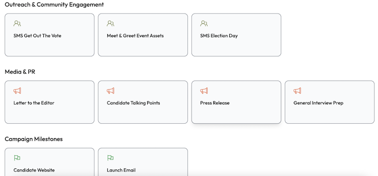 Free tools include access to campaign content generation tools, where candidates can create content instantly from dozens of templates, including speeches, press releases, and email blasts.