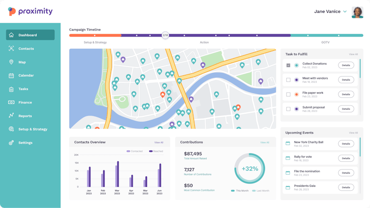 Proximity is a political campaign management software that combines task coordination, finance tracking, voter engagement, and unique mapping tools to help political candidates, elected officials, and organizations streamline operations and connect with supporters.