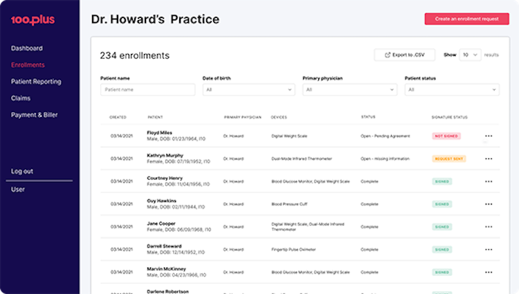 100Plus is a remote patient monitoring platform that helps healthcare providers enroll, onboard, and monitor patient health across multiple areas, including blood pressure, blood glucose, temperature, weight, heart activity, and more. The alert functionality automatically sends notifications to doctors regarding at-risk patients with attached patient reports and alert priority, such as high, medium or low.