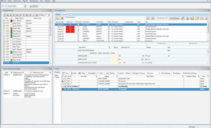 ABELMed EHR’s physician dashboard offers users an overview of their schedule and tasks to be completed, with daily and weekly appointment breakdowns, patient encounters, investigations and lab results, pending and completed forms, and high-priority open tasks all available in a single interface. A patient manager also tracks the time of patients’ arrivals, their waiting periods, and their progression through the office.