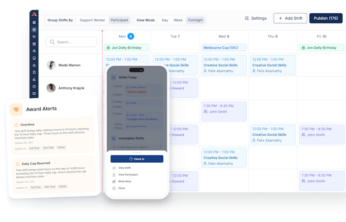 Build compliant rosters without the spreadsheet headache. Astalty's smart scheduling matches support workers to shifts based on availability, skills, location, and participant preferences — automatically. Before you publish, built-in SCHADS award alerts flag any overtime, broken shifts, daily cap breaches, or allowance issues, with the relevant clause referenced so your team knows exactly why. Support workers get instant push notifications when rosters change, and clock in and out via GPS on their phones. Whether you're managing direct one-on-one supports, recurring shifts, or group activities with staff ratios and capacity limits, it's all handled in one place.