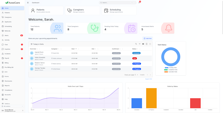 AveeCare is a cloud-based management platform designed for non-medical and personal care agencies. The platform centralizes administrative workflows for agencies of varied sizes and client models including private pay, Medicare, Medicaid, and long-term care insurance. It integrates scheduling, billing, payroll, compliance documentation, and real-time care tracking into a single unified system. The software emphasizes adherence to Electronic Visit Verification requirements and HIPAA standards for protected health information.