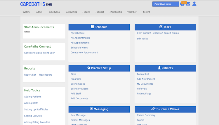 CarePaths EHR offers a range of features including a patient database, compliance tracking, e-prescribing, appointment management, customizable clinical documentation and treatment plans, automated recurring tasks, and a self-service portal. The platform enables users to create calendar events to help manage appointments, charges, receipts, and progress notes. CarePaths EHR also helps users process claims with built-in accounting functionality, online payment processing, automated statements, and email reminders.
