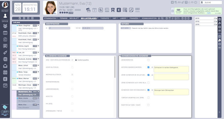 claire supports dental practices with the day-to-day management of patients, staff, services, and finance. The web-based software platform provides a selection of different functions to support these tasks. claire can be adapted to suit the requirements of each respective practice.