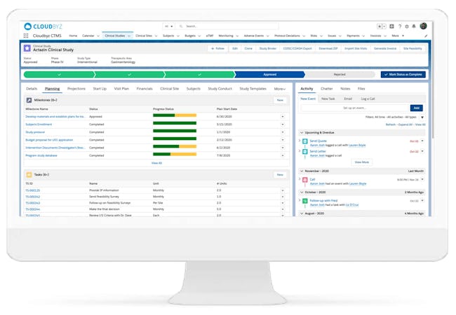 Cloudbyz's Clinical Trial Management System (CTMS) is a cloud-based clinical trial operations management solution natively built on Salesforce's platform. It enables end-to-end management across all phases of the clinical study with real-time visibility and analytics across study planning, start up, study management, and close out. Cloudbyz CTMS functionality includes: