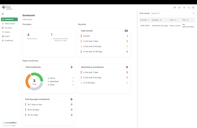 CredWallet serves as a secure digital credential repository for healthcare providers, enabling clinicians to upload, manage, and share professional credentials via a centralized interface. This module incorporates AI-powered extraction to parse credential documents, automated reminder systems for expiration dates, and bidirectional communication tools that preserve transparency between clinicians and credentialing specialists throughout the verification lifecycle. The platform adheres to SOC two and HIPAA compliance standards to safeguard sensitive provider information and protected health data.