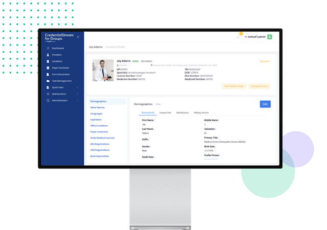 The solution supports a range of administrative tasks, including onboarding, provider enrollment, credentialing, and comprehensive provider data management.